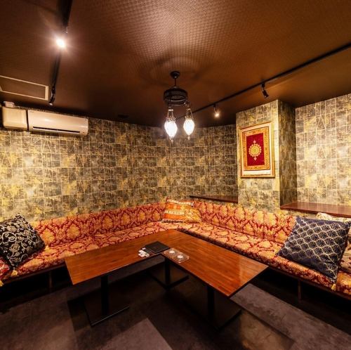 10名様以上が入れる広々個室は大画面モニター付きで動画視聴や音楽再生もでき、大人数にも最適!ラグジュアリーな内装とエキゾチックな装飾が特別感を演出します★快適なクッション、ソファタイプの席で長時間もゆったり過ごせる設計です◎またWi-Fiや電源も完備!ボードゲームも楽しめます♪